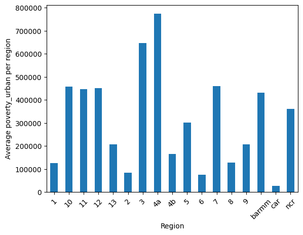 NCR has the most, followed by region 4A, region 7, region 3, and lastly, region 11. As explained earlier, there is a slight correlation amongst the number of urban poverty and total number of crime, and this holds true for the top five (5) regions.