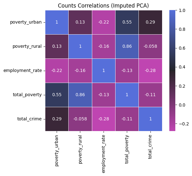 Analyzing this correlation heatmap, it seems that urban poverty (poverty_urban) has the greatest correlation among the other variables with respect to the total crimes (total_crime) committed in a region. Then, employment rate (employment_rate) takes the second indicator; although, note that it shows a negative correlation. Finally, rural poverty (poverty_rural) lastly follows, showing a very close to zero (0) (i.e., absent) correlation to crime.