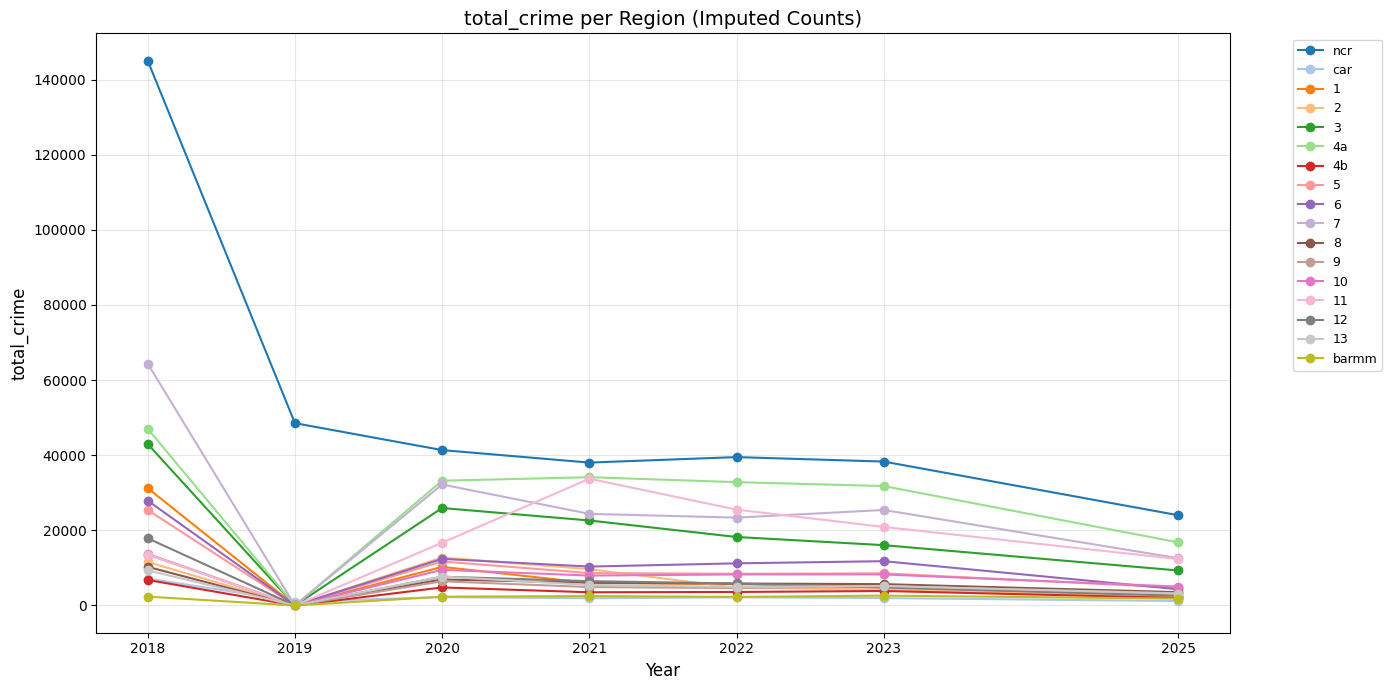 The total crime per region all have a declining trend from 2018 to 2025.