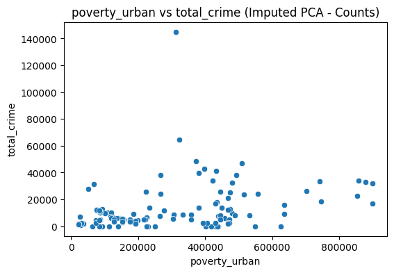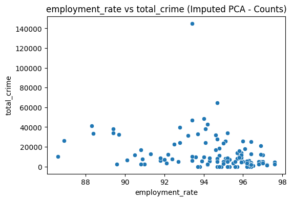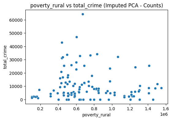 Scatter plots were done to visualize the relationships of poverty and employment with crime. We compared urban poverty, rural poverty, and employment rate to total crime.