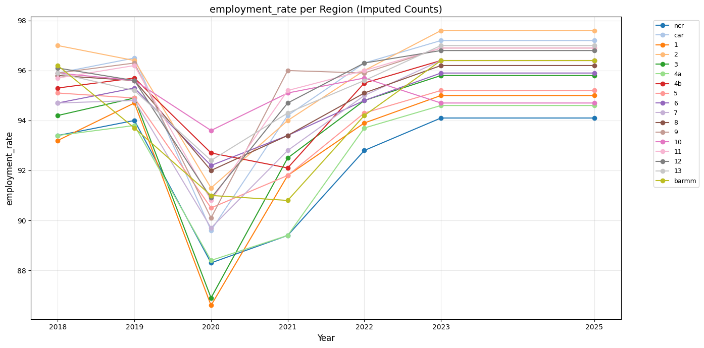 Employment rate also took a huge drop in 2020 possibly due to the pandemic, but it rose back the following year in 2021 and continued to rise or remain stagnant until 2025.