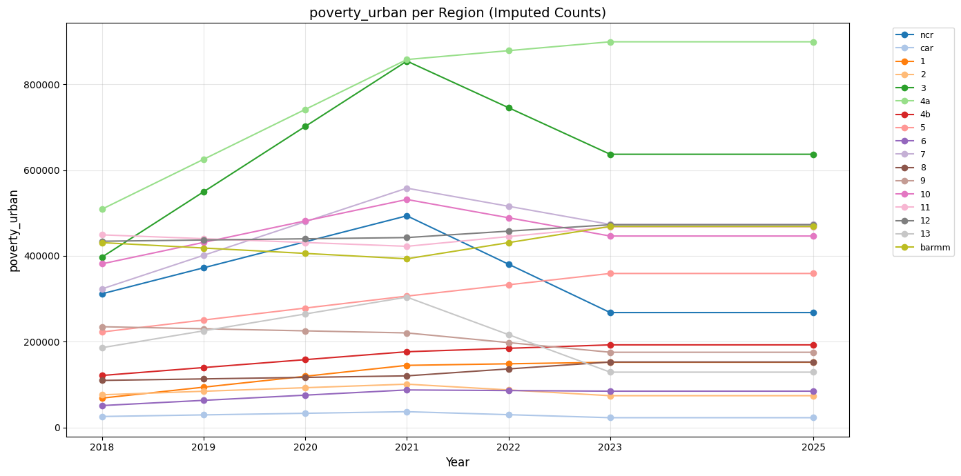 Urban poverty rose from 2018 to 2021 possibly due to the pandemic, and some regions started to recover after the peak in 2021 and declined back through 2022 to 2025.